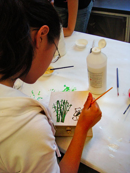 with acrylics or dye-stains; gold leafing with size; add polyurethane